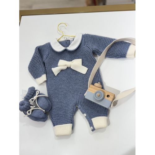 Tutina azzurra con collo ricamato bianco e bordino azzurro, fiocco al centro panna con pulsino e piedino panna con babbucce abbinate.