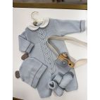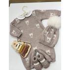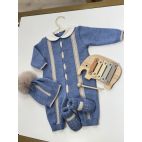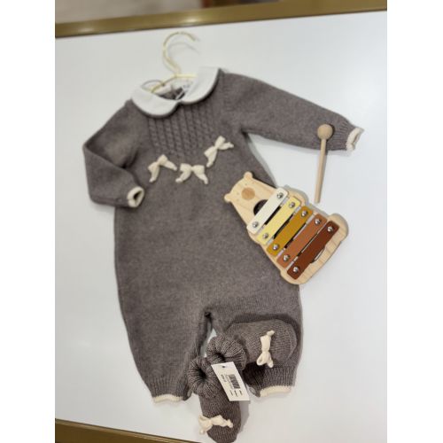 Tutina biscotto e panna elaborata con trecce al petto e tre fiocchi bianco con babbucce. Unisex Prodotto artigianale. 100% Lana Merino. Made in Italy.