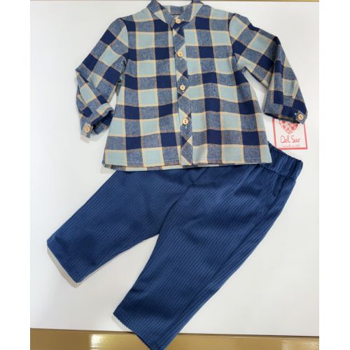 Camicia in caldo cotone a quadri blue - verde acqua e beige con pantalone in velluto a coste blue