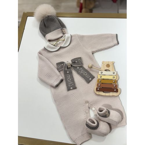 Tutina con fiocco al centro + cappello con pelliccia vera e babbucce. Unisex. 100% Lana pettinata. Col: Vulcano/NaturalBio. Made in Italy.