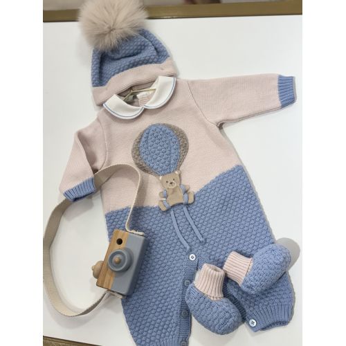 Tutina NaturalBio/cielo polvere , con cappellino con pelliccia vera e babbucce coordinato. 100% lana pettinata. Alta qualità.