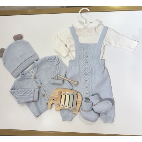 Saloppette con ricamo a treccia e punti tortora, body in caldo cotone, cardigan , cappellino con orecchie e babbucce abbinate. Alta qualità.