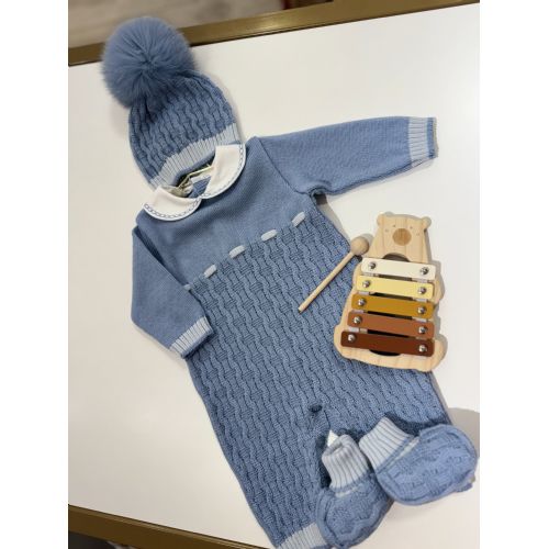 Tutina polvere con colletto bianco e bordino elaborato polvere, trama con ricamo cielo, cappellino con pelliccia vera e babbucce coordinate.
