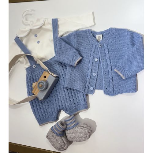 Pagliaccetto in Lana colore polvere con bodino in caldo cotone collo elaborato e cardigan polvere con bordino grigio e babbucce grigie con righe polvere coordinate.