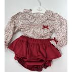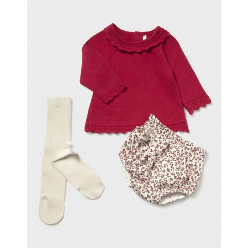 maglia rossa con culotta a fantasia e fiocco laterale con calze neutra