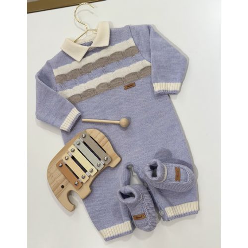 Tutina cielo con righe ondulate beige e tortora colletto bianco, manica e piedino con bordino bianco e babbucce cielo e panna !