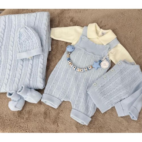 USCITA CLINICA azzurro e Bianco. Pagliaccetto con cardigan e maglietta con colletto ,cappellino e babbucce abbinata per ultimo la sua copertina azzurra a trecce. un misto lana 50%